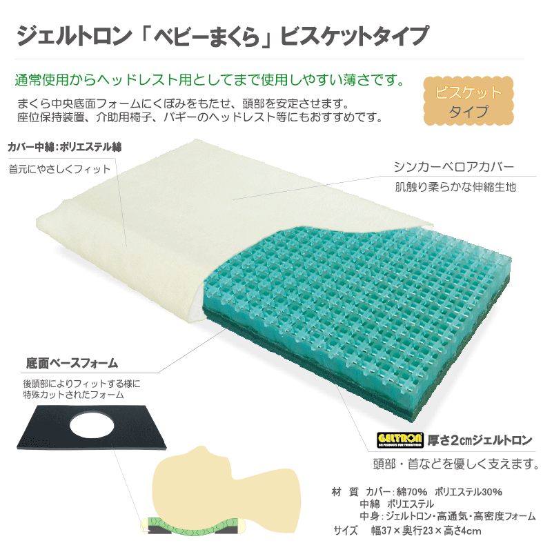ジェルトロン・ベビーまくら(ビスケットタイプ) サイズ(cm):幅37×奥行23×高さ4 カバー:綿70%・ポリエステル30%(シンカーパイルカバー)、中綿ポリエステル 中身:ジェルトロン・ウレタン ※枕カバーは付属しておりません。